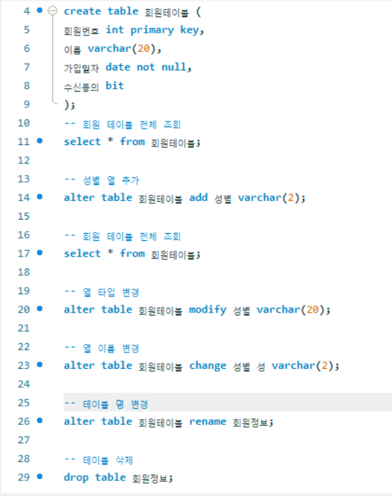 └ 테이블이나 관계의 구조를 생성하는데 사용하며 CREATE, ALTER, DROP,TRUNCATE 문 등이 있다.