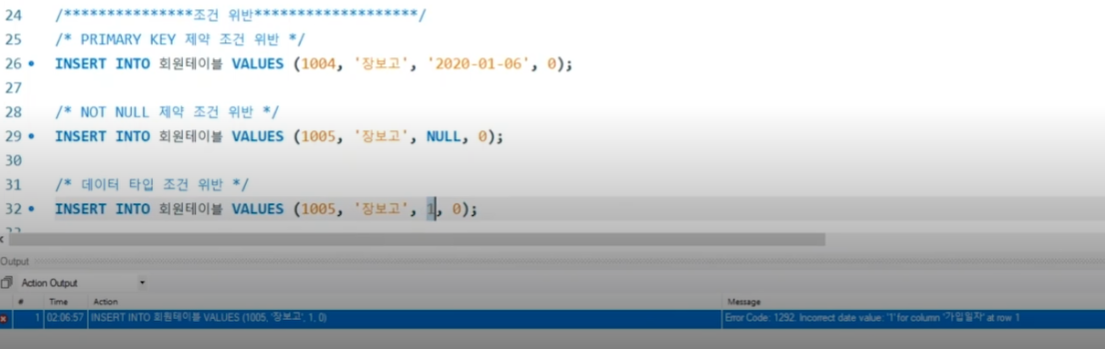 조건 위반. 1줄은 고유번호를 다시 사용. 2줄은 not null 제약 조건 위반. 3줄은 데이터가 date 형이 아님.