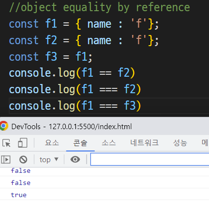 === :두개의 값 비교 + 데이터 타입 비교 (둘다 같아야 true 반환)